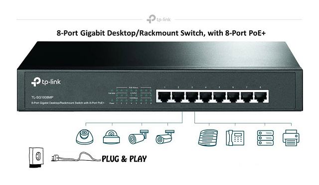 TL-SG1008MP is easy to install and use. It requires no configuration or installation. With its Desktop/Rack mountable design, outstanding performance and quality, the TP-Link TL-SG1008MP 8-Port Gigabit Desktop/Rack mountable Switch with 8-Port PoE is a great choice for expanding your home or office network.